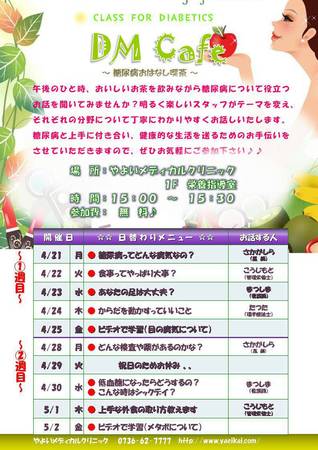 以下、4月のDMcafe(糖尿病教室)4/22(火)~5/2(金)のスケジュールをお知らせ致します。