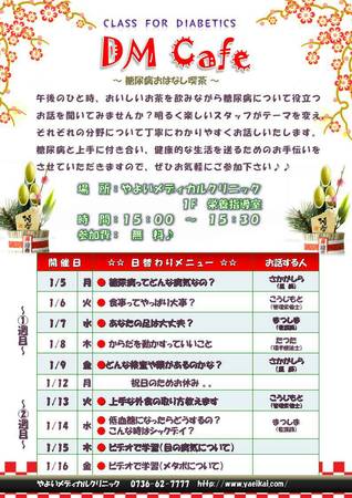 以下、今年第1回目のDMcafe(糖尿病教室)1/5(月)~1/16(金)のスケジュールをお知らせ致します。