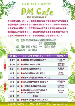 以下、8月はじめのDM cafe(糖尿病教室)8月1日(木)~8月9日(金)のスケジュールをお知らせ致します。