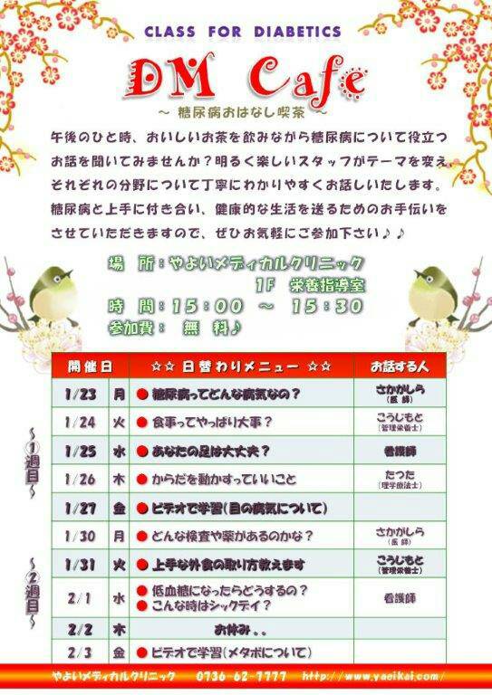 以下、1月・2月のDMcafe(糖尿病教室)1/23(月)~2/3(金)のスケジュールをお知らせします。