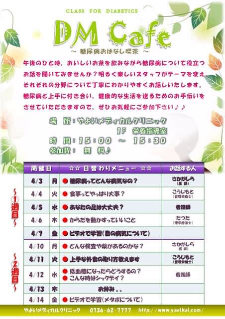 以下、4月のDMcafe(糖尿病教室)4/3(月)~4/14(金)のスケジュールをお知らせします。