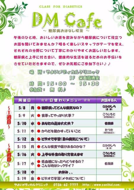 以下、5月のDMcafe(糖尿病教室)5/8(月)~5/19(金)のスケジュールをお知らせします。