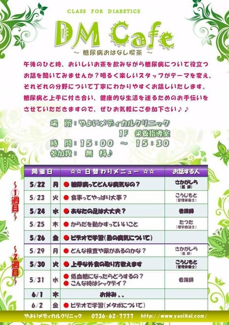 以下、5月のDMcafe(糖尿病教室)5/22(月)~6/2(金)のスケジュールをお知らせします。