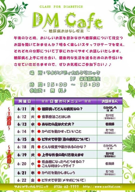 以下、6月のDMcafe(糖尿病教室)6/11(月)~6/22(金)のスケジュールをお知らせします。