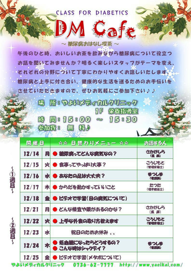 以下、12月のDMcafe(糖尿病教室)12/14(月)~12/25(金)のスケジュールをお知らせします。