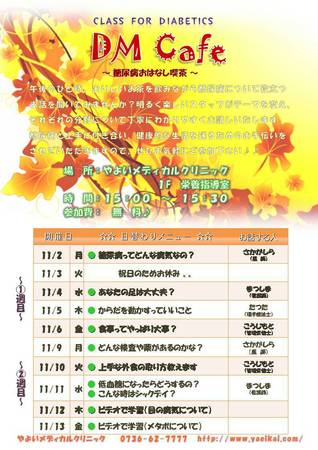 以下、11月のDMcafe(糖尿病教室)11/2(月)~11/13(金)のスケジュールをお知らせします。