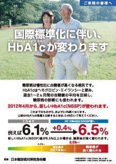2012年4月1日より糖尿病の診療で用いられるHbA1c(ヘモグロビン・エイワンシーと読みます)の表示に国際的によく使われているNGSP値が用いられることになりました。