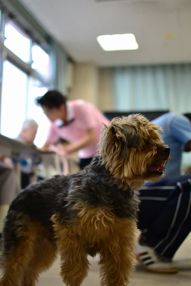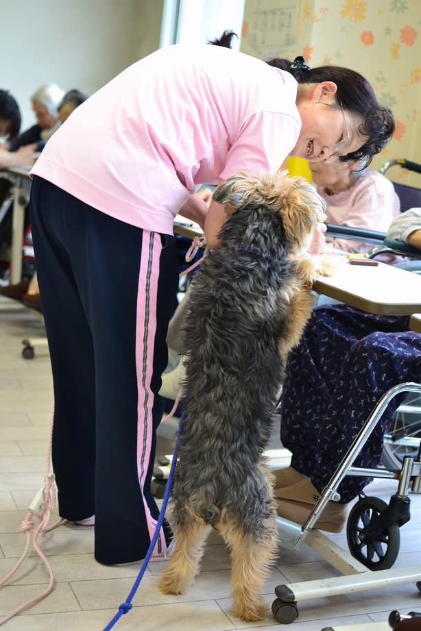 普段、ケージの中から利用者様の安全を見守っている『小助くん』ですが、この日はケージを飛び出して大好きなおじいちゃん、おばあちゃん達と触れ合えるという事で大張り切り!