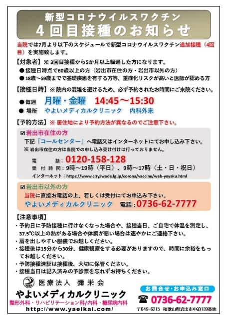 当院では7月より以下のスケジュールで新型コロナウイルスワクチン追加接種(4回目)を実施致します。