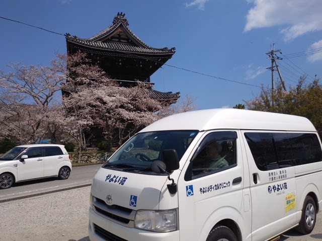 道中は和やかな雰囲気で会話されたり、普段の送迎では見られない景色を楽しまれたりしながら走行していきます。根来寺に着くまでにもあちらこちらで桜がみられ、春を感じさせる情景が広がっていました。