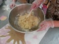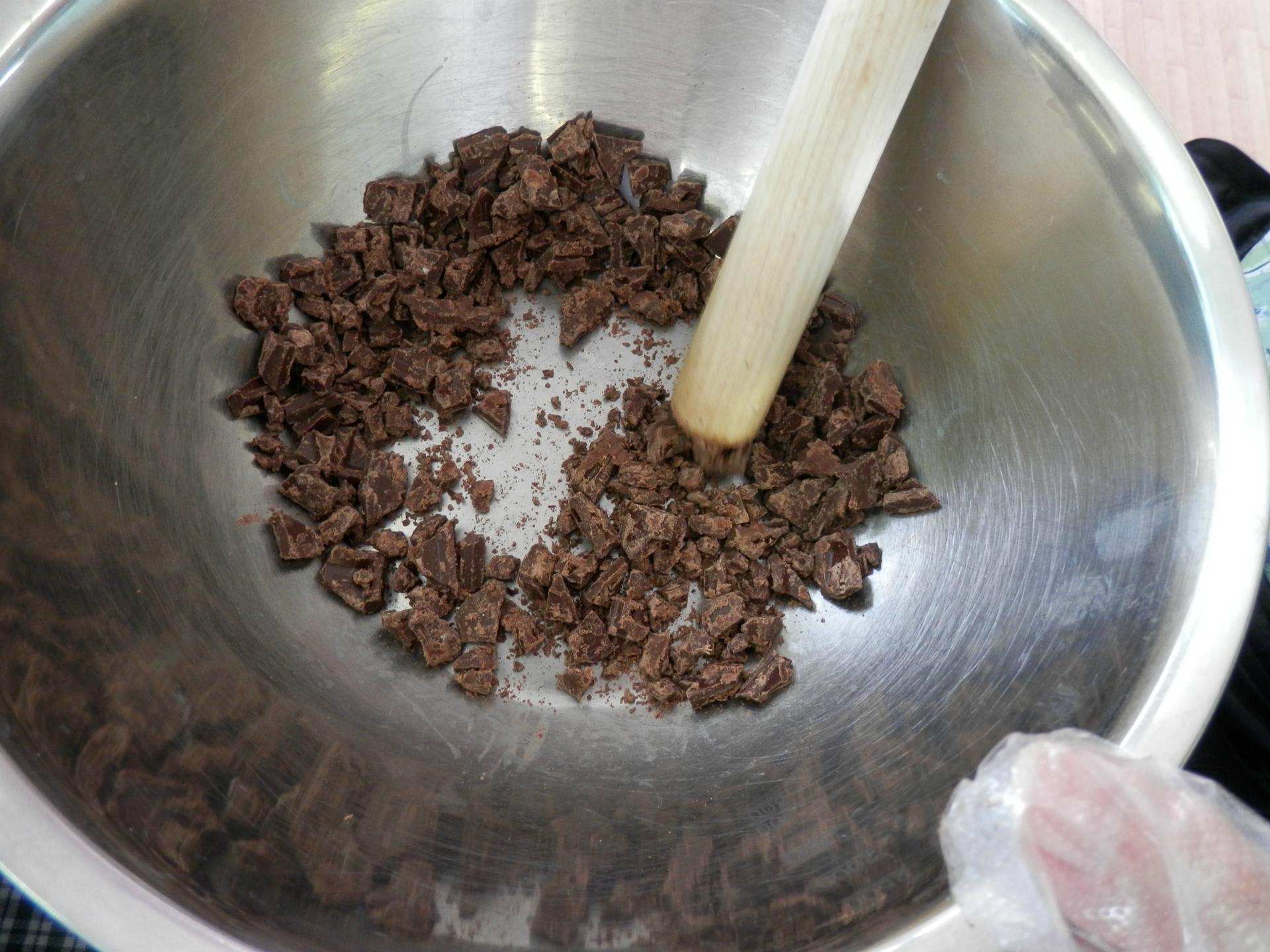 生地を作っている間に、板チョコを擂粉木(すりこぎ)で砕きました。