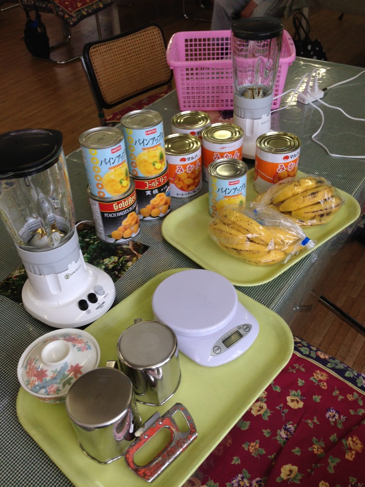 今回のミックスジュースに使用したフルーツは、バナナ、みかん、パイナップル、モモです。