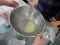 ボールに溶かしたバター、ホットケーキミックスを入れて混ぜ、牛乳を少しずつ入れ、混ぜて生地を作りました。
