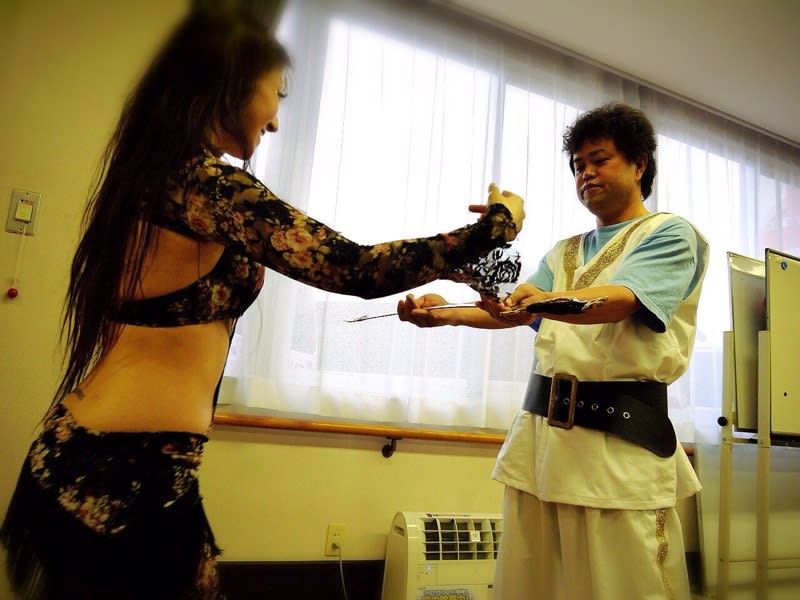 そのあとは、ベリーダンスのレクチャーもしていただき、職員が前に出てレクチャーを受けましたが、慣れない動きに四苦八苦しながらも一生懸命踊り、会場からは笑い声と拍手が起こりました。