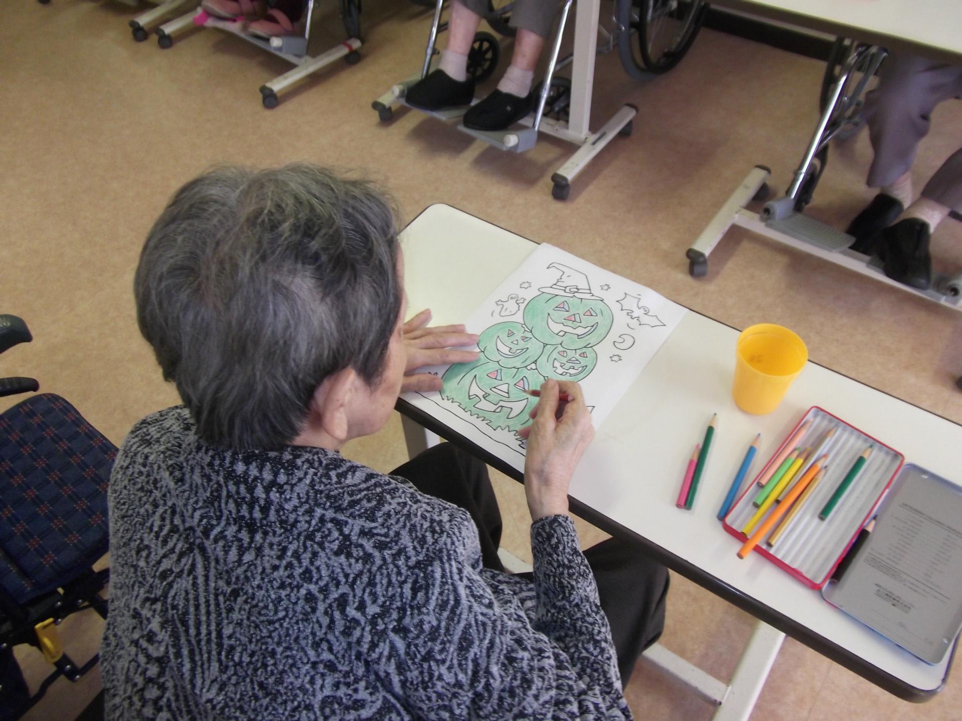 という事で、ハロウィーンの塗り絵をしていただきました。