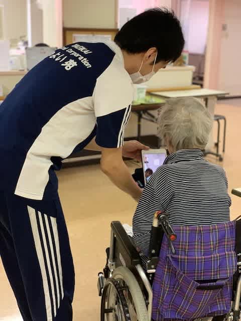 コロナウイルス感染拡大に伴い面会停止となり、少しでも元気なお顔を見てお話していただければとの思いで、携帯電話を使用してのリモート面会の取り組みを開始しました!