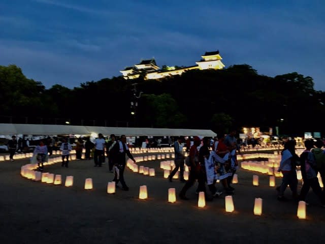 辺りが薄暗くなると、全ての燈篭に火が灯され、幻想的な風景となり、人々の思いをより一層深めるひとときとなりました。