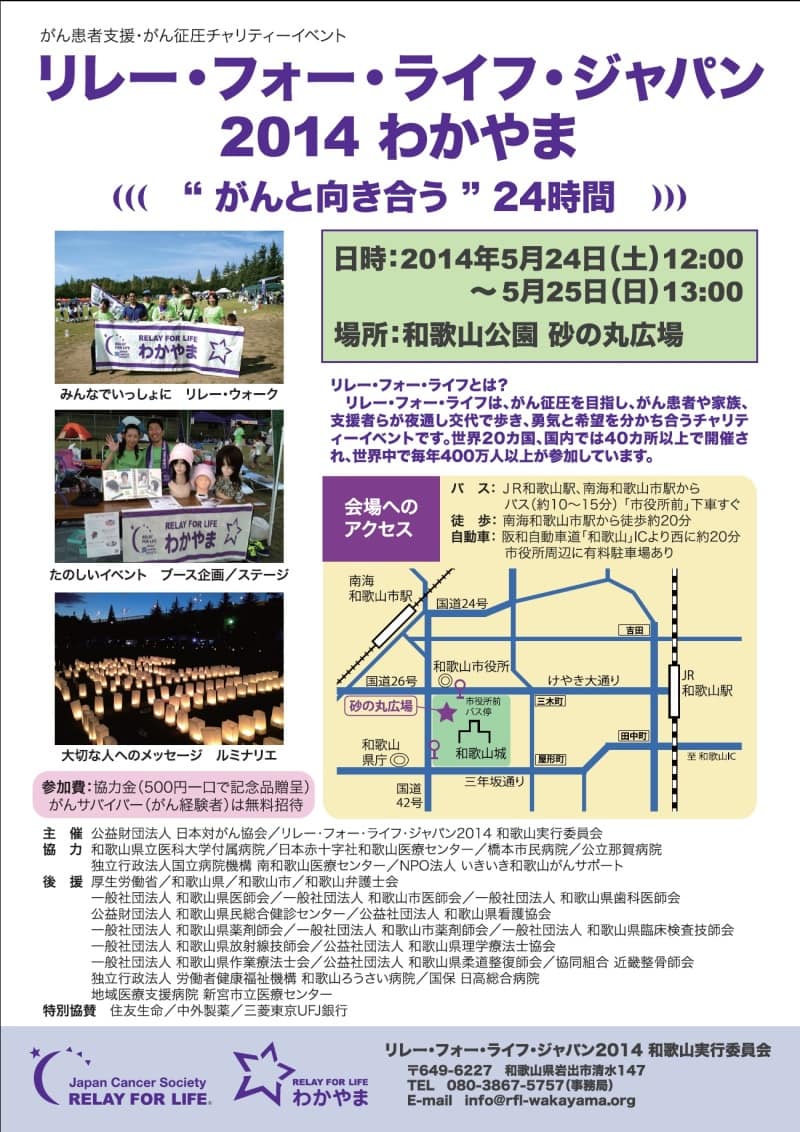 5月24日(土)12時から25日(日)13時まで和歌山公園砂の丸広場において「リレー・フォー・ライフ・ジャパン2014わかやま」が開催され、和田本部長始め法人スタッフもイベントに参加致します。