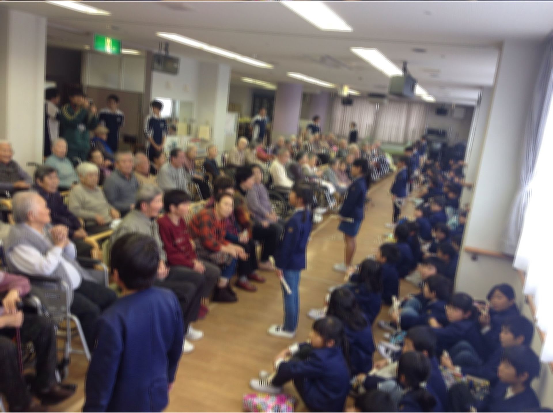 やよい苑入所者様・デイケア利用者様は小学生との交流をとても楽しみにされており、会場では小学生の到着を今か今かと心待ちにされている様子でした。