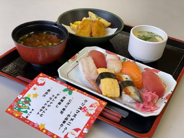 昼食のメニューは皆様大好きにぎり寿司、クリスマスという事でチキンナゲットとフライドポテトの盛り合わせ、茶碗蒸し、赤だしを提供させて頂き、皆様から「おいしかった」とのお言葉を頂きました。
