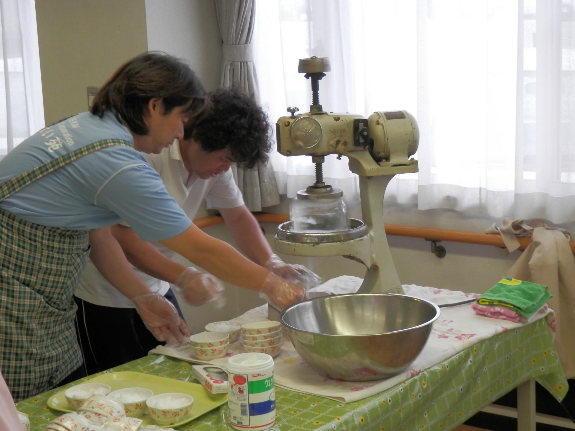 スタッフが用意したかき氷器と氷屋さんで買ってきた氷をセットし、レクリエーションスタート!