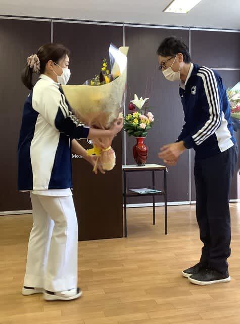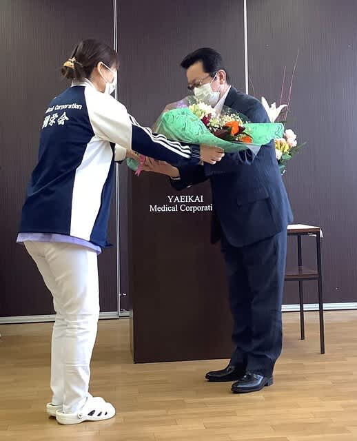 次に、全国老人保健施設協会表彰を受賞された林事務長へ、やよい苑の黒田総看護部長より花束を、黒山理事長より記念品が贈呈されました。