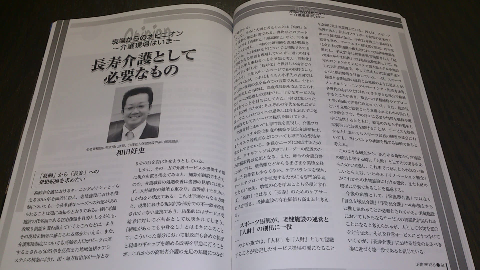 先日ブログでもお伝えしておりましたが、和田本部長の執筆内容が掲載された全国老人保健施設協会機関誌「老健」6月号が発行されました。