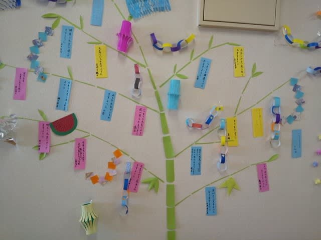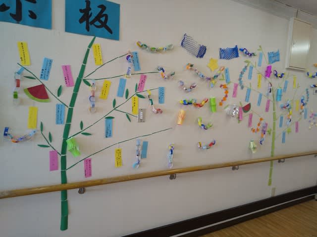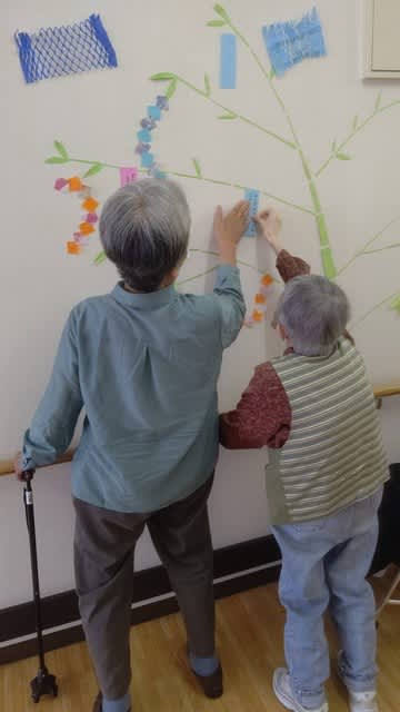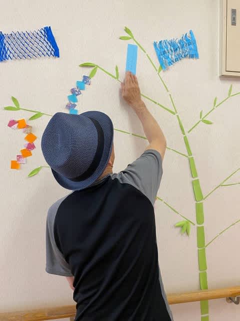「元気でいれますように」「歩けますように」と、利用者様の願いを込めた短冊も飾り、素敵な七夕飾りができました!
