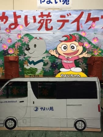 今年の作品は、秋に因みまして、満開のコスモス畑の中を、当法人のマスコットキャラクターである「やよいちゃん」と和歌山国体マスコットキャラクターの「きいちゃん」がデイケアの送迎車と一緒に楽しく過ごしている様子が表現されています。