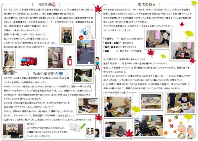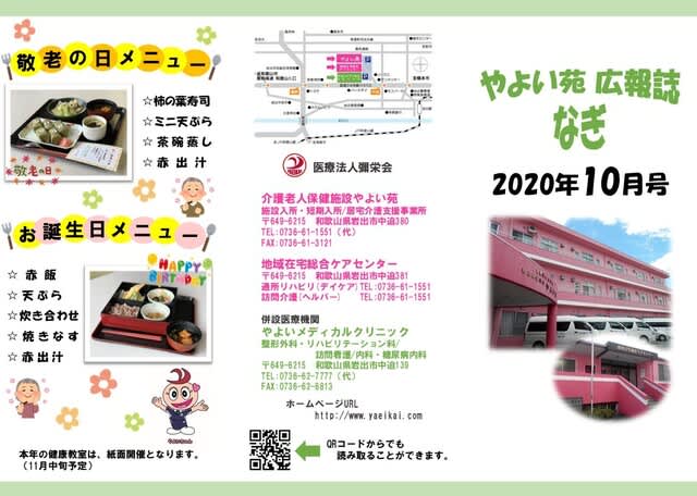 介護老人保健施設やよい苑 広報誌「なぎ」10月号 2020.10.01 10月号の内容は ☆敬老の日 ☆消防訓練 ☆Web企業説明会 となっております。 表面には敬老の日メニュー・お誕生日メニューをご紹介! 是非ご覧ください! 敬老イベント 前の記事 窓越し面会について 次の記事