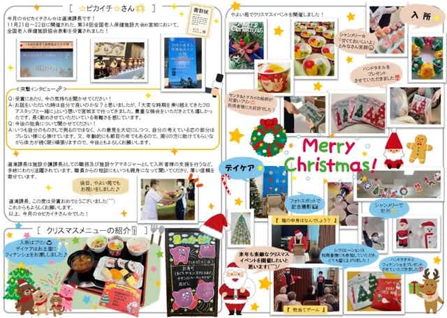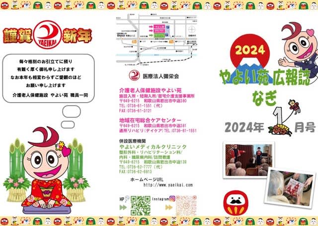 介護老人保健施設やよい苑 広報誌「なぎ」1月号 2024.01.02 あけましておめでとうございます! 2024年1月号広報誌「なぎ」の内容は ☆ピカイチ☆さん ☆入所・デイケアのクリスマスイベント ☆クリスマスメニューの紹介 となっております。 是非!ご覧ください♪ 介護老人保健施設やよい苑 -和歌山県岩出市の介護施設- 岩出市の介護老人保健施設やよい苑の情報。デイケア、ショートステイ、訪問介護、居宅介護支援を行っております。 介護老人保健施設やよい苑 投稿者:なぎ編集委員会 新年のご挨拶 前の記事 クリニック便り~高濃度ビタミンC点滴 期間限定・冬の割引キャンペーンのお知らせ~ 次の記事