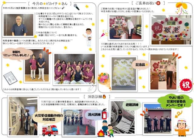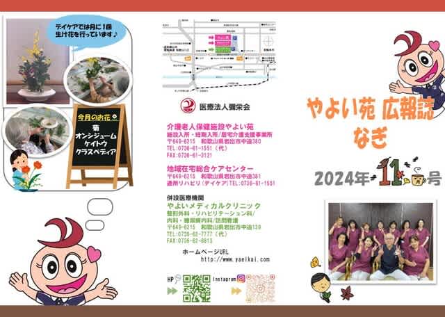 介護老人保健施設やよい苑 広報誌「なぎ」11月号 2024.11.01 11月号内容は ☆今月の★ピカイチ★さん ☆ご長寿お祝い㊗ ☆消防訓練🔥 となっております! 是非ご覧ください♪ 介護老人保健施設やよい苑 -和歌山県岩出市の介護施設- 岩出市の介護老人保健施設やよい苑の情報。デイケア、ショートステイ、訪問介護、居宅介護支援を行っております。 介護老人保健施設やよい苑 投稿者:なぎ編集委員会 広報誌「なぎ」10月号 前の記事 クリニック便り~11月14日は世界糖尿病デー~ 次の記事