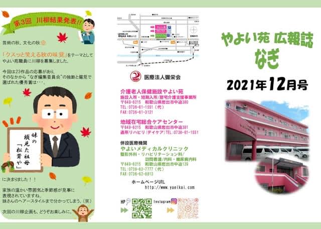 介護老人保健施設やよい苑 広報誌「なぎ」12月号 2021.12.01 12月号広報誌「なぎ」の内容は ☆やよい苑文化祭🍂 ☆岩出市文化祭🍁 ☆入所おやつレク🍩 となっております! 是非ご覧ください♪ http://www.yaeikai.com/kaigo-index.html 投稿者:なぎ編集委員会 クリニック便り~糖尿病性腎症重症化予防研修会~ 前の記事 クリニック便り~12月4日は有床診療所の日~ 次の記事