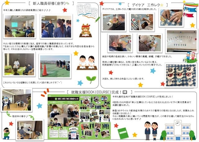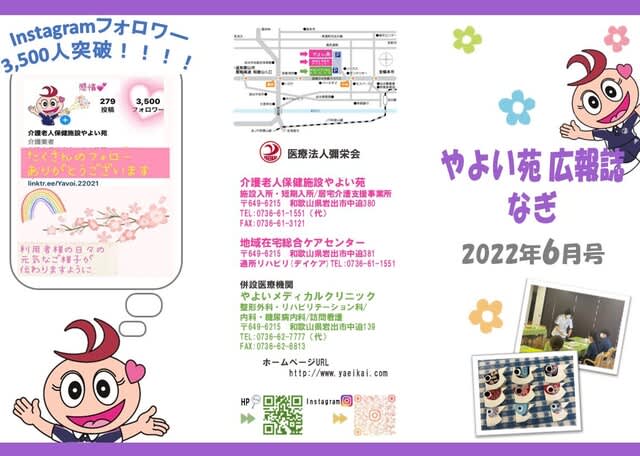 介護老人保健施設やよい苑 広報誌「なぎ」6月号 2022.06.01 6月号内容は ☆デイケア工作レク☆ ☆新人職員研修(座学)✎ ☆就職支援BOOK(COURSE)完成!📖 となっております! 是非ご覧ください♪ 介護老人保健施設やよい苑 -和歌山県岩出市の介護施設- 岩出市の介護老人保健施設やよい苑の情報。デイケア、ショートステイ、訪問介護、居宅介護支援を行っております。 介護老人保健施設やよい苑 投稿者:なぎ編集員会 クリニック便り~高濃度ビタミンC点滴 期間限定・割引キャンペーン(令和4年6月~9月)のお知らせ~ 前の記事 タイトル:クリニック便り~新型コロナウイルスワクチン・4回目接種のお知らせ~ 次の記事