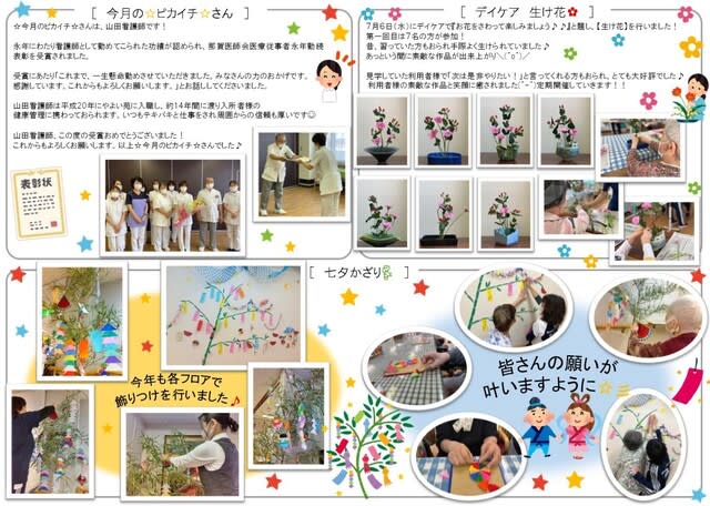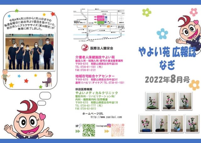 介護老人保健施設やよい苑 広報誌「なぎ」8月号 2022.08.01 8月号内容は ☆デイケア 生け花🌻 ☆今月の☆ピカイチ☆さん🌟 ☆七夕かざり🎋 となっております! 是非ご覧ください♪ https://www.yaeikai.com/kaigo-index.html 投稿者:なぎ編集員会 広報誌「なぎ」7月号 前の記事 クリニック便り~「栄養の日・栄養週間」をご存知ですか?~ 次の記事