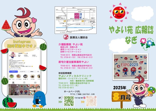 介護医療院 やよい苑 広報誌「なぎ」8月号 2025.08.01 8月号内容は ☆七夕飾り🎋 ☆大阪万博記念フォトカード📷 ☆消防・防災訓練🔥 となっております! 是非ご覧ください♪ 介護医療院やよい苑 -和歌山県岩出市の介護施設- 岩出市の介護医療院やよい苑の情報。デイケア、ショートステイ、訪問介護、居宅介護支援を行っております。 介護医療院やよい苑 投稿者:なぎ編集委員会 広報誌「なぎ」7月号 前の記事 まいなぁが9月号に掲載されました♪ 次の記事