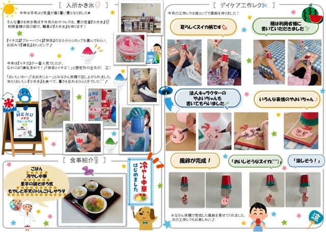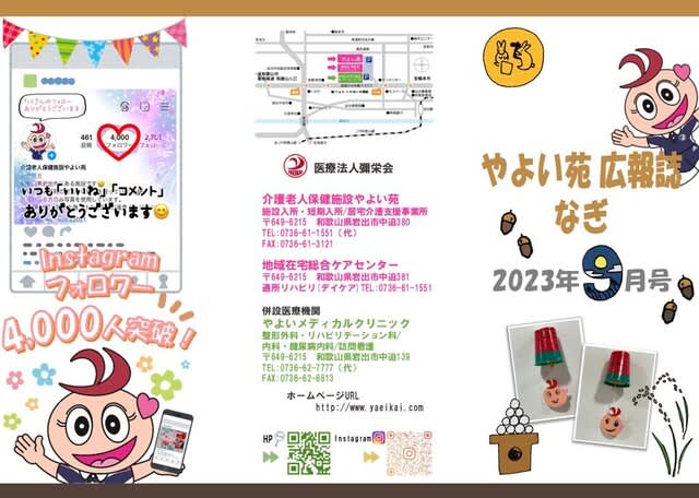 介護老人保健施設やよい苑 広報誌「なぎ」9月号 2023.09.01 9月号内容は ☆入所 かき氷🍧 ☆デイケア 工作レク🎐 ☆食事紹介🍴 となっております! 是非ご覧ください♪ 介護老人保健施設やよい苑 -和歌山県岩出市の介護施設- 岩出市の介護老人保健施設やよい苑の情報。デイケア、ショートステイ、訪問介護、居宅介護支援を行っております。 介護老人保健施設やよい苑 投稿者:なぎ編集委員会 クリニック便り~「栄養の日・栄養週間」をご存知ですか?~ 前の記事 クリニック便り~2023年インフルエンザワクチン予防接種のお知らせ~ 次の記事