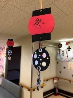 今年はバージョンアップして、踊り子さんに加え、入所者様がレクリエーションで作成した、花火と提灯のモチーフも登場しています。