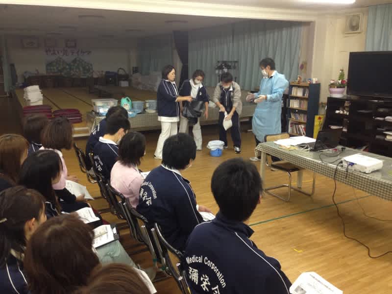 勉強会では、資料を用いてそれらの説明がなされ、説明後にはノロウイルスを想定したロールプレイを行い、それぞれの役割や処理方法を再確認致しました。