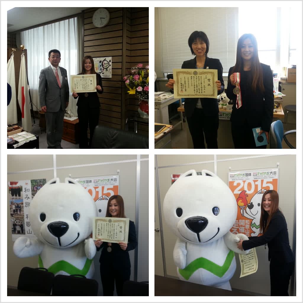 山下県議会議長・若宮国体推進監 ・星課長はじめ、関係職員の皆さまや、紀の国わかやま国体のマスコットキャラクターの「きいちゃん」にも祝福され、大嶋選手も謝辞を述べ、その後、記念撮影を行いました。