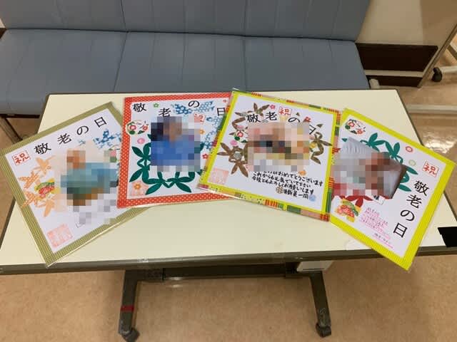 やよい苑では、毎年敬老会として、利用者様に集まっていただきスタッフの出し物を見てもらいますが、今年は新型コロナウィルス感染拡大防止のため、各フロアごとに利用者様へ色紙の贈呈と、おやつを食べていただくことになりました。