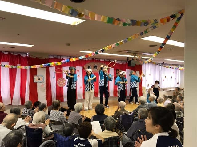 職員の手拍子と掛け声に合わせて利用者様も参加して下さり、すだれが様々な形に変わるのをお楽しみいただき、途中のハプニングも職員が上手く進行を行い笑いに変えるなど、笑える要素もありながら利用者様との一体感を感じることのできる演目となっておりました。