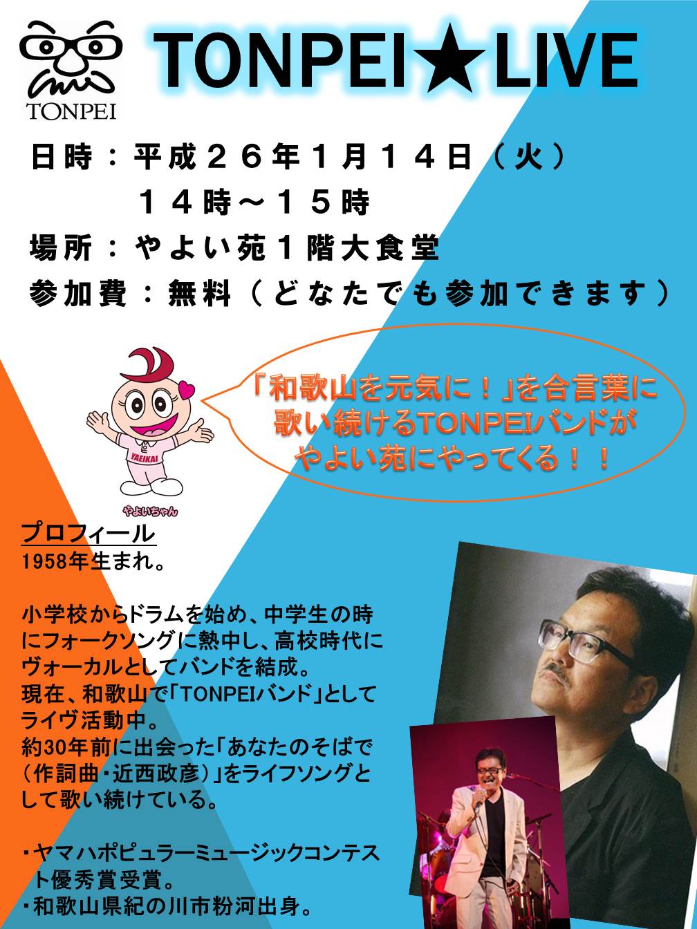 先日のブログでもお知らせ致しましたが、1月14日(火)にやよい苑で『新春TONPEIライヴ』が開催されます。