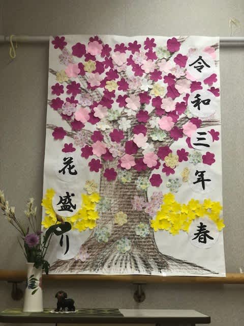 「桜の貼り絵」は職員の家族が描いてくれた幹に桜の花を貼ってできあがりました。