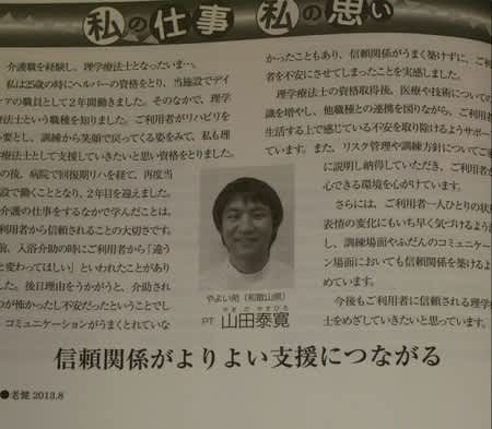 全国老人保健施設協会機関紙『老健』8月号「私の仕事 私の思い]に、やよい苑機能訓練課 山田泰寛PTが投稿を行った「介護職を経験し、理学療法士となったいま・・・」が掲載されました。