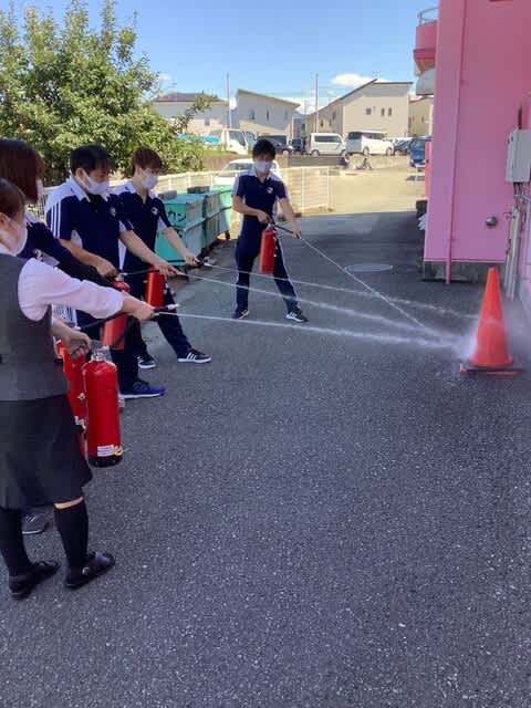 消火活動では、初めて消火器に触れる職員もいるため、手順を確認しながら基本的な操作を学びました。
