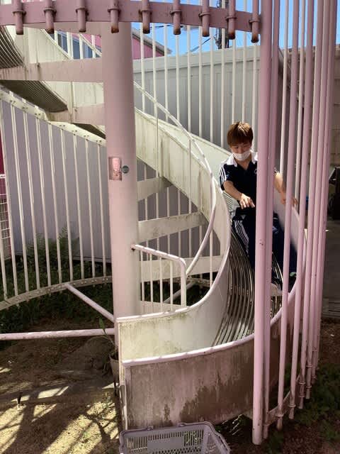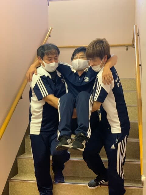 避難誘導では、火災発生時はエレベーターが使用できないため、避難経路である階段と、避難用滑り台を活用した訓練を行いました。