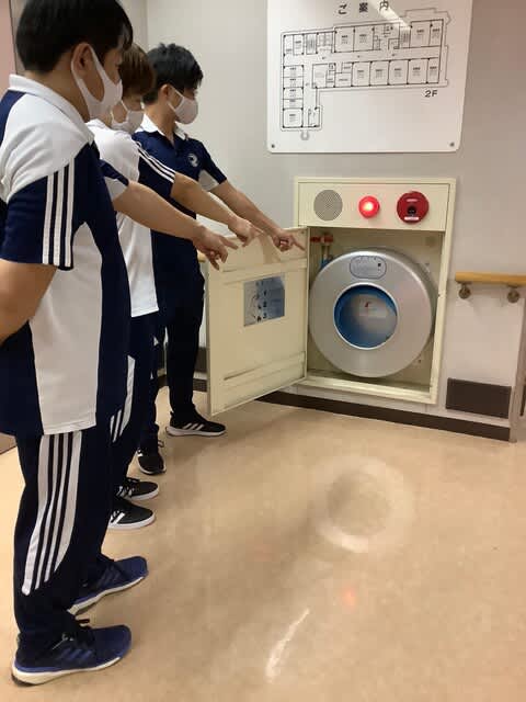 9月15日(火)に災害対策委員会主催の消防訓練を実施しました。消防設備を点検した後、夜間に館内で火災が発生したことを想定し、消火活動と避難誘導を行いました。