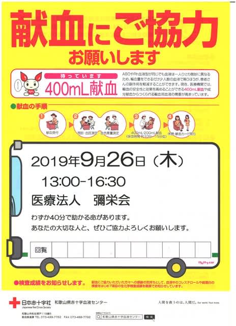 令和元年9月26日(木) 彌栄会駐車場にて献血を実施いたします。