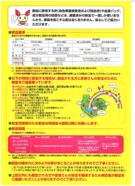 日本国内では、1日あたり約3,000人の患者様が輸血が必要と言われ、また使用する血液も現在のところ人口造成、長期保存が叶わないため、必要な血液を確保するためには一時期に偏ることなく多くの方々(1日あたり約13,000人とのこと)の献血への協力が必要とされているそうです。